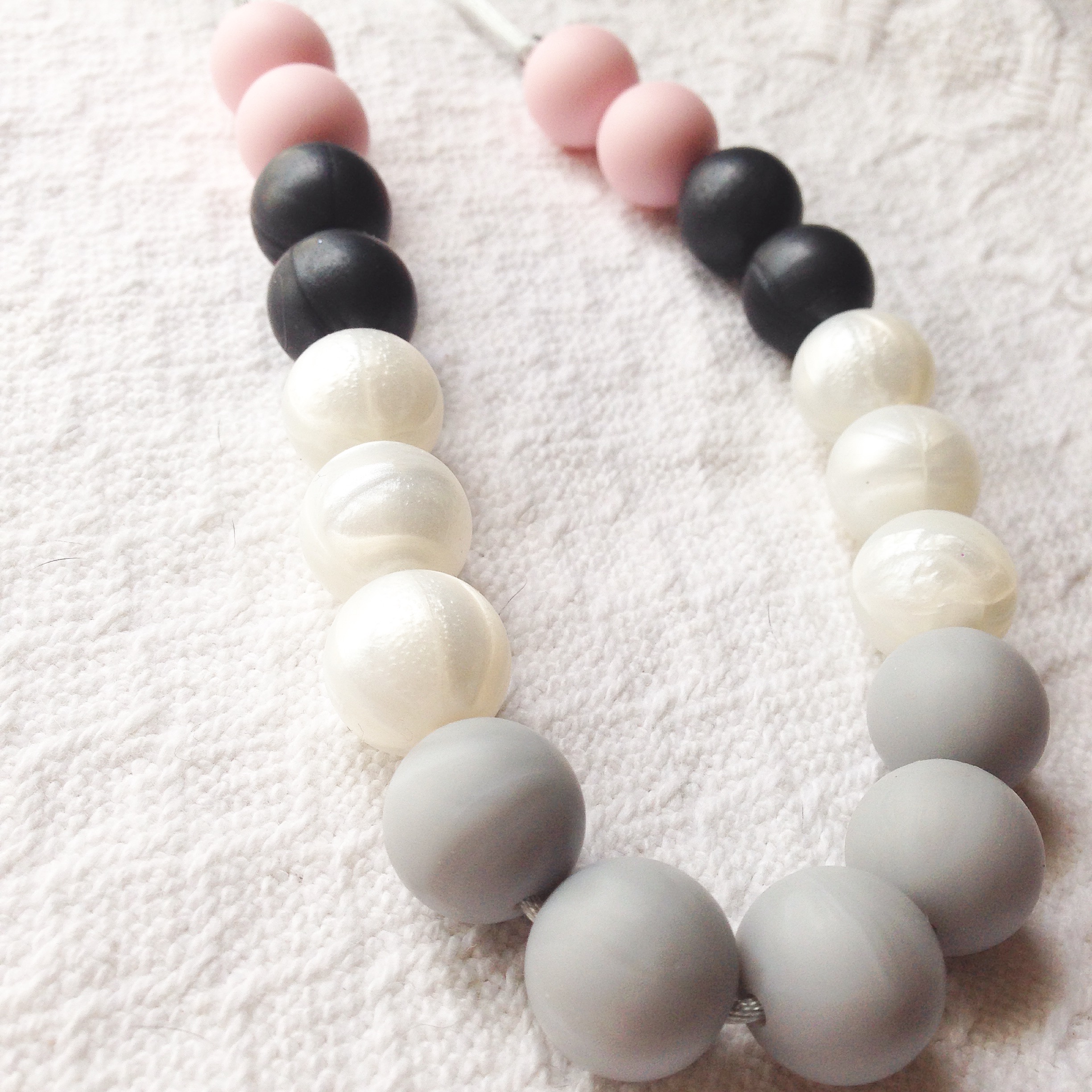 This teething necklace was designed for the stylish teething baby-yet stylish for mama too. Necklaces are made with high quality food grade silicone so they are perfect for little curious hands and mouths.