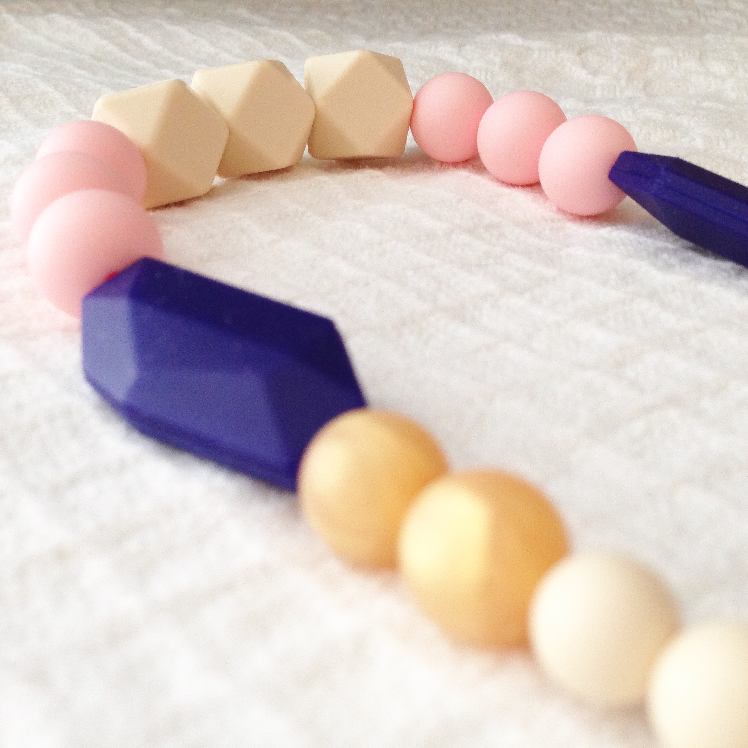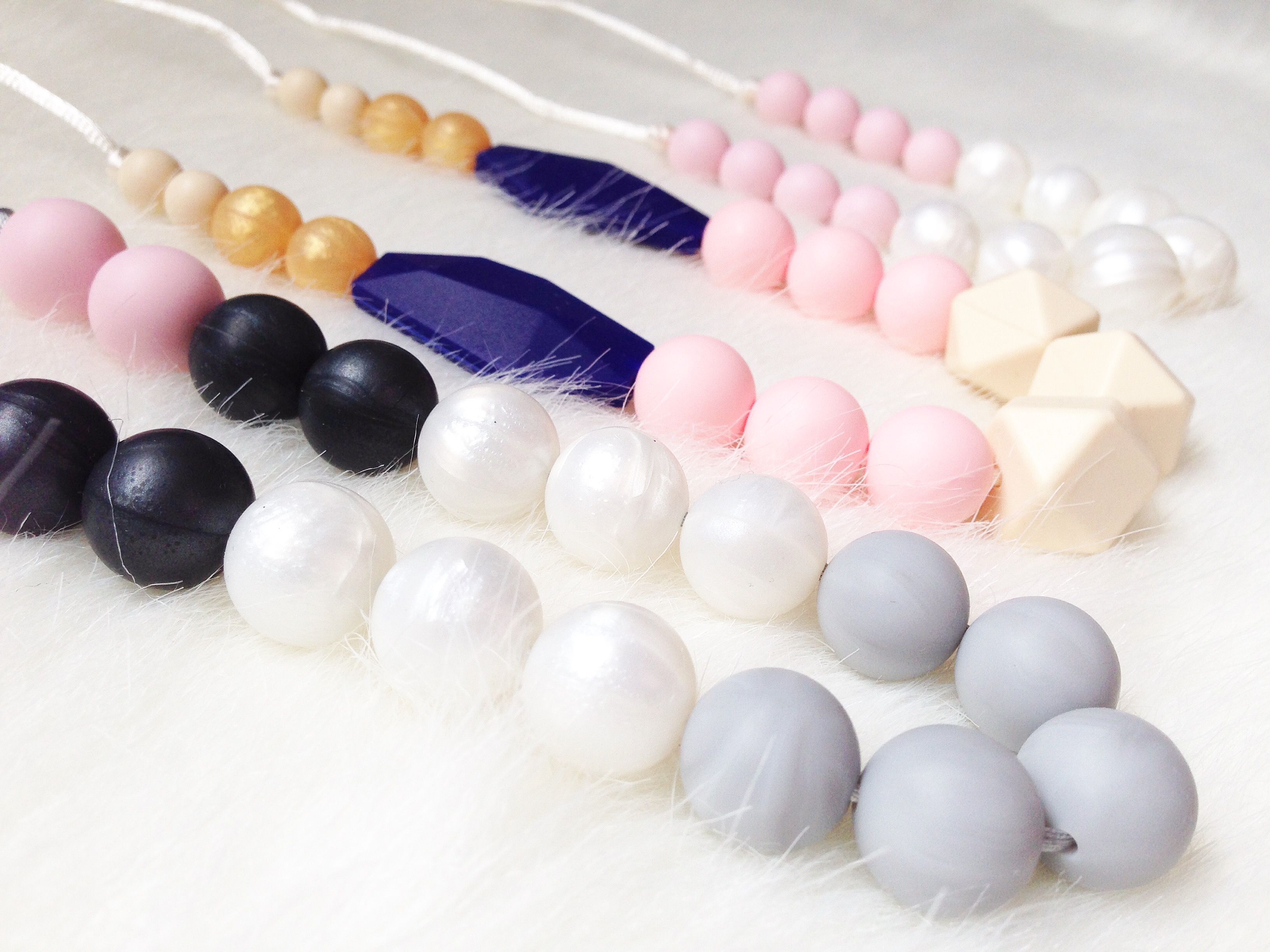 This teething necklace was designed for the stylish teething baby-yet stylish for mama too. Necklaces are made with high quality food grade silicone so they are perfect for little curious hands and mouths.