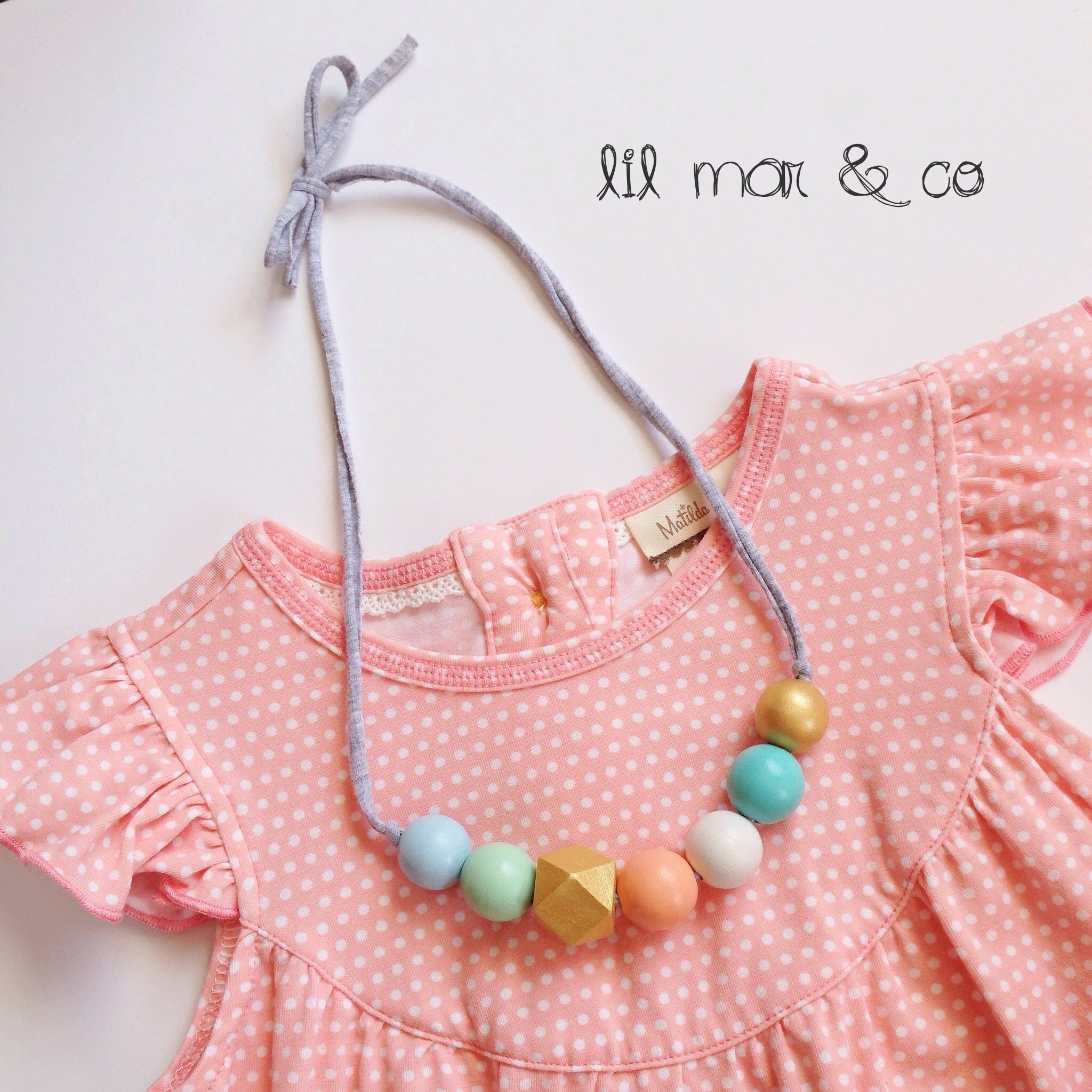 This sweet comfy necklace is made with hand painted wood beads and soft knit fabric. Each bead is carefully painted with several coats of non toxic paint and sealed with a non toxic ~ water based sealant. The necklace measures approximately 29" in length and can be customized to fit small girls to adult by tying in a bow or knot. This necklace is lightweight to ensure lots of comfortable wear. The necklace is a perfect statement piece to any outfit from graphic t-shirt to a fancy dress.