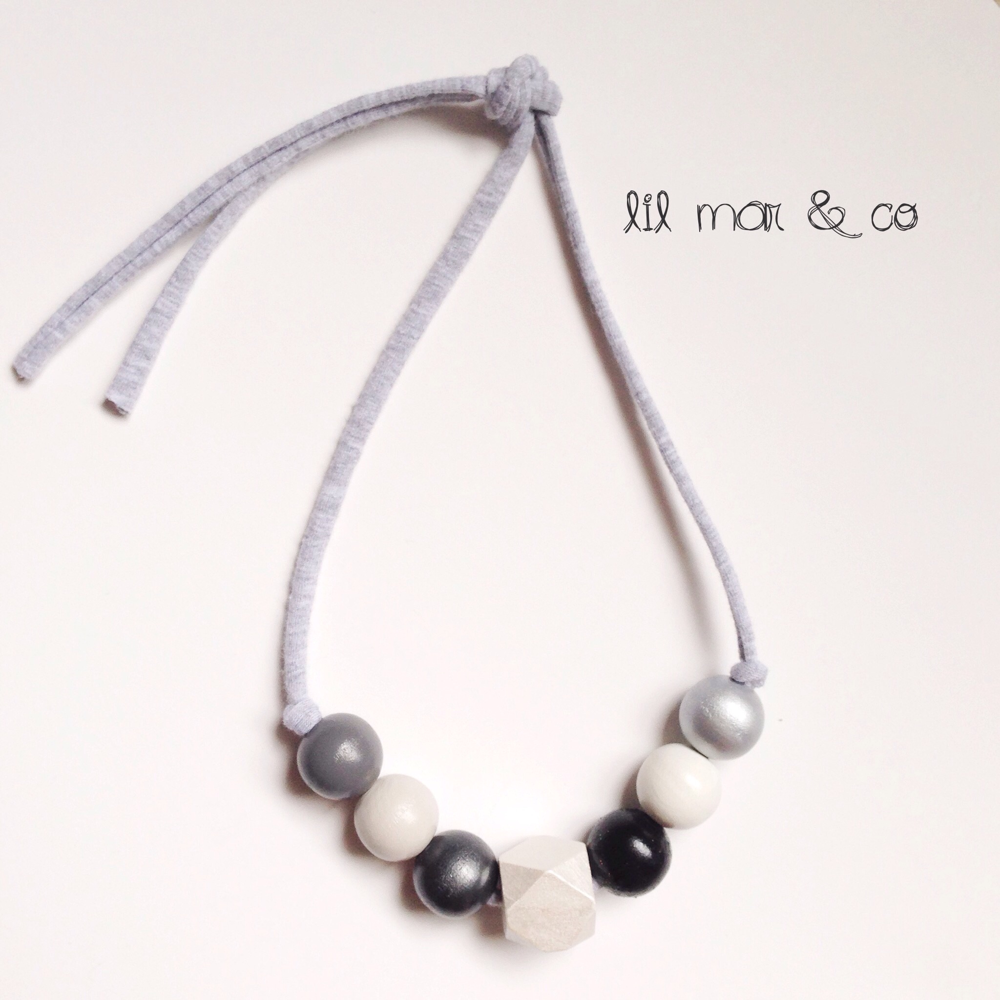 This necklace is made with grays, silver, and black colored beads strung on a soft gray knit string.