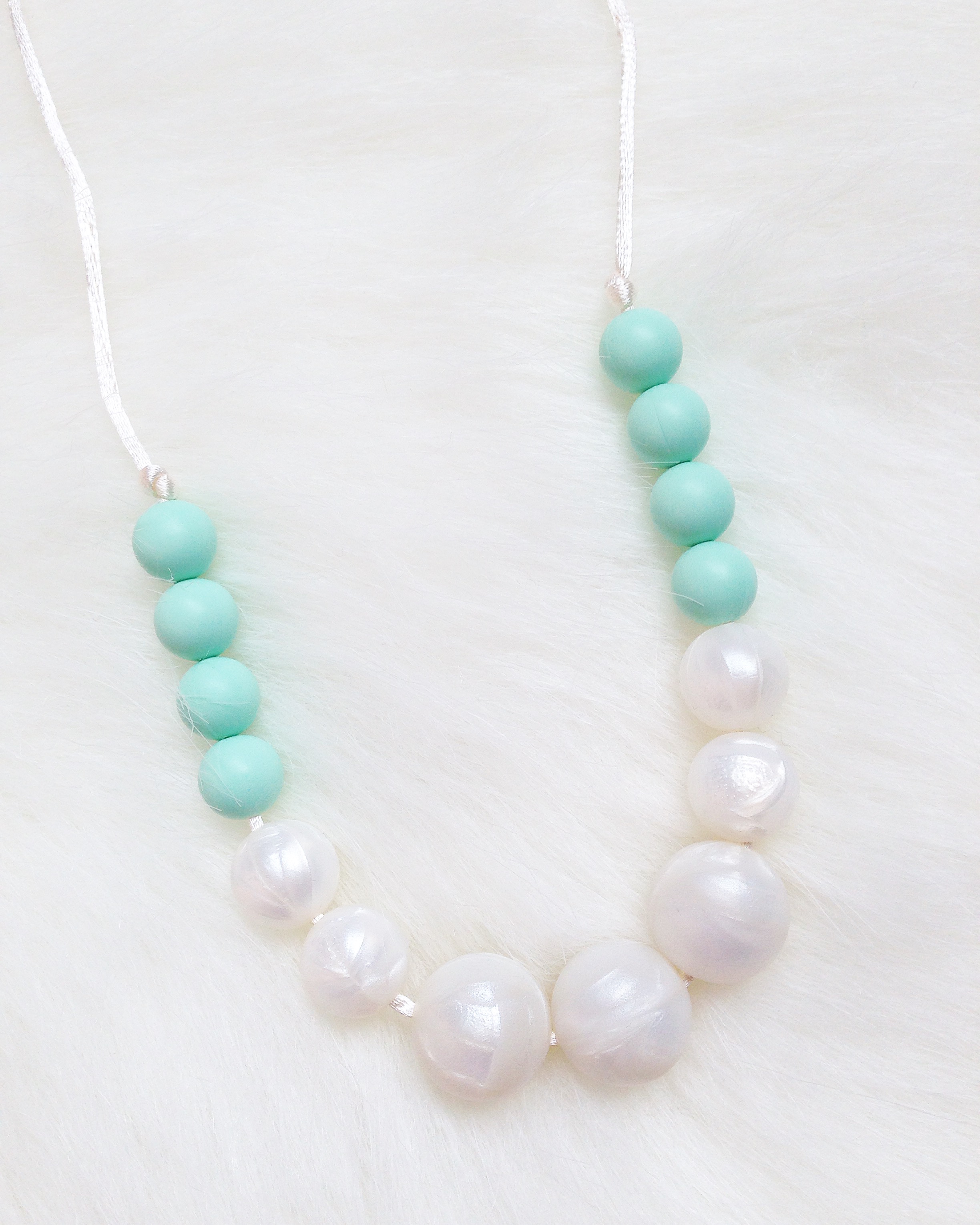 This pearl teething necklace was designed for the stylish teething baby-yet stylish for mama too. Necklaces are made with high quality food grade silicone so they are perfect for little curious hands and mouths.