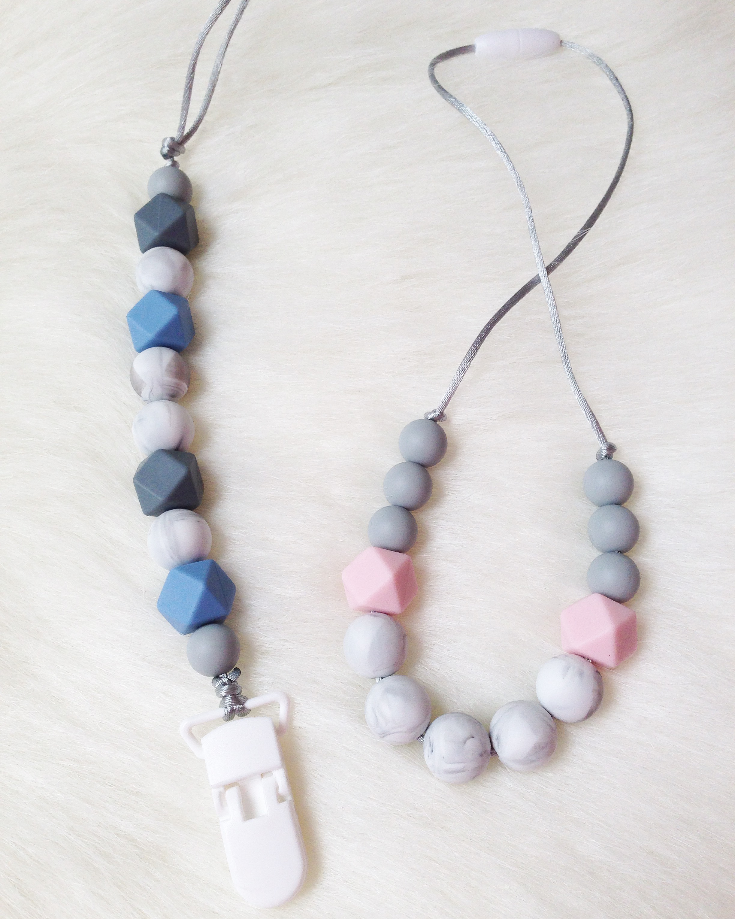 This teething necklace was designed for the stylish teething baby-yet stylish for mama too. Necklaces are made with high quality food grade silicone so they are perfect for little curious hands and mouths.